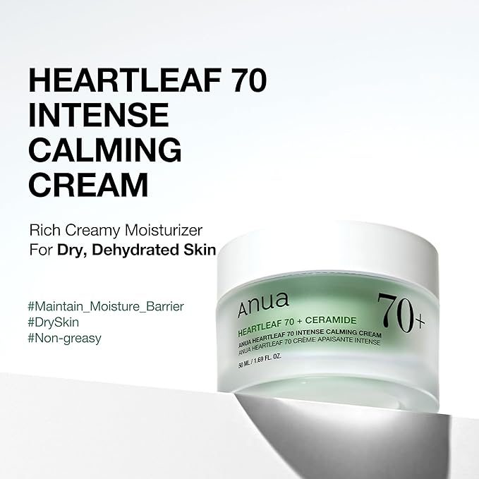 ANUA Heartleaf 70 Intense Calming Cream is expertly formulated to strengthen and repair the skin barrier while delivering deep hydration. Suitable for all skin types, especially dry and sensitive skin, this non-greasy cream calms irritation and restores comfort. Its key natural ingredients, including Houttuynia Cordata Extract, Ceramide NP, and Panthenol, work together to soothe and reinforce your skin’s defenses. Free from fragrance and harsh additives, it ensures gentle yet effective moisturizing, promoting resilient, healthier skin with every use.